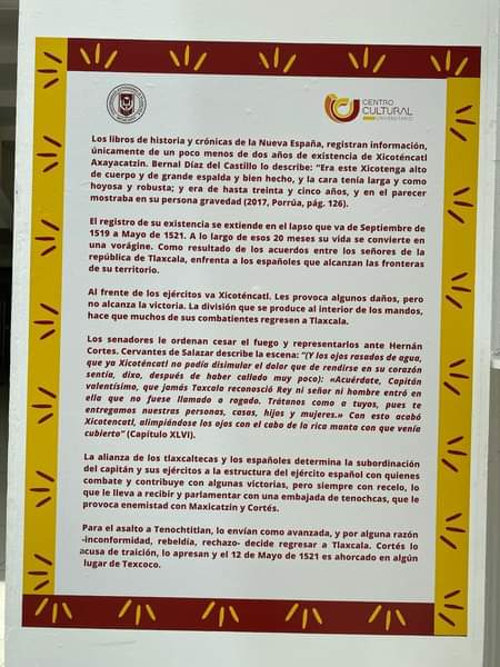 Durante el evento inaugural de la exposición pictórica, García Toriz recordó que Xicohténcatl se opuso a la alianza con los españoles, aunque, al final, con el propósito de obedecer al gobierno representado por los cuatro principales señores de la Antigua República de Tlaxcallan se unió a la alianza y al combate contra los mexicas.