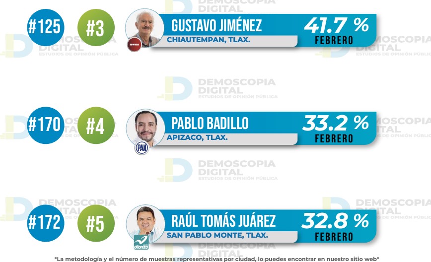 En febrero, Gustavo Jiménez, de Chiautempan, y Pablo Badillo, de Apizaco, registraron calificaciones de 41.7% y 33.2%, respectivamente, situándose en los lugares tercero y cuarto a nivel estatal, y 125 y 170 a nivel nacional.