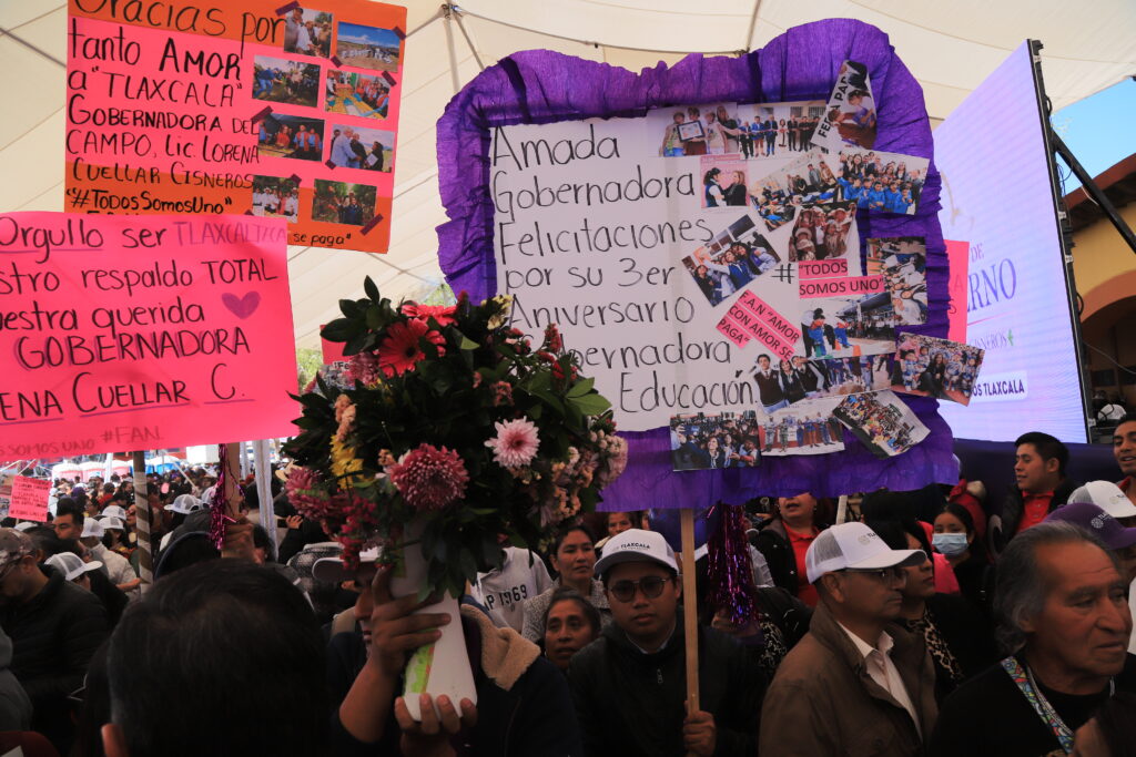 En los pasillos y sillería, se podían leer carteles que decían: “Gracias, gobernadora”, “Reconozco su visión para impulsar el desarrollo del estado” y “La memoria de la gratitud tlaxcalteca está contigo, Lorena Cuéllar”. Incluso se escucharon voces que proclamaban: “¡Es un honor estar con Obrador!” y “¡Es un honor estar con Lore hoy!”.