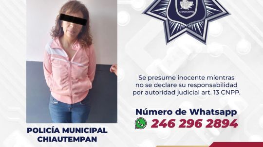 Elementos de la Policía Municipal de Chiautempan, detuvieron a una mujer que se encontró responsable de cometer el delito de robo a una tienda comercial, ubicada en la calle Antonio Díaz Varela, de la colonia centro.