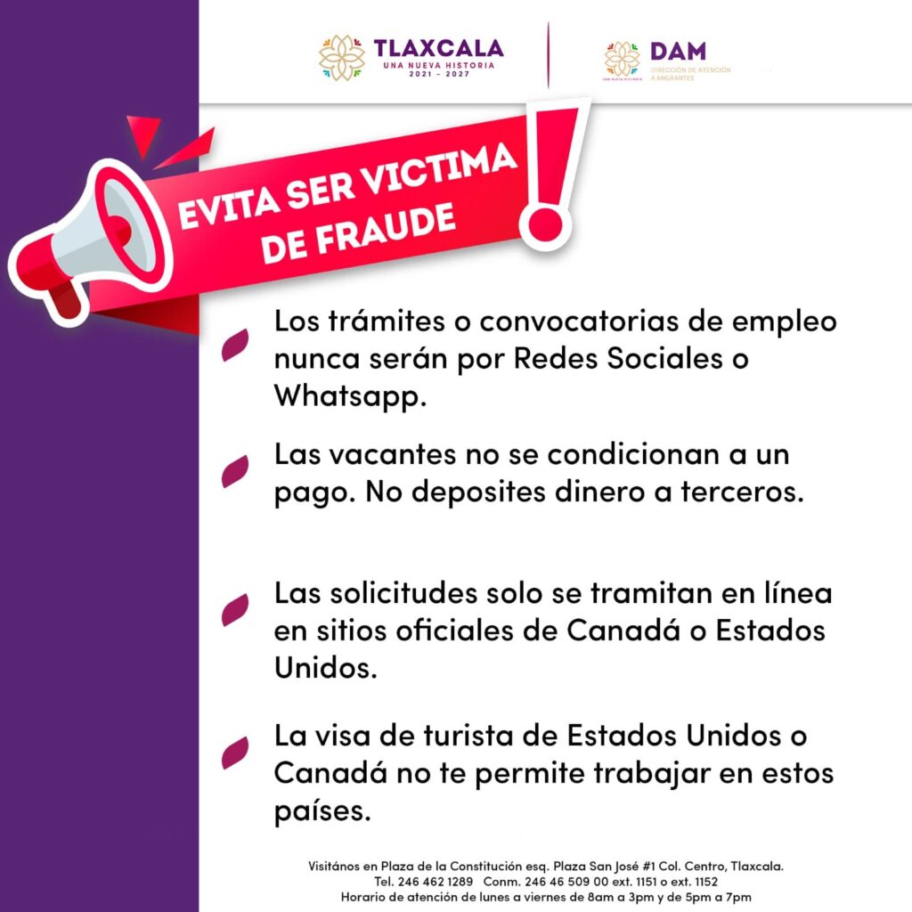 La Dirección de Atención a Migrantes (DAM), informa a la ciudadanía tlaxcalteca que los trámites de pasaportes mexicano y americano, visa americana o canadiense, doble nacionalidad, empleo temporal, entre otros, solo se deben hacer en instituciones gubernamentales oficiales, los cuales son gratuitos; a fin de evitar que sean víctimas de fraudes cibernéticos.