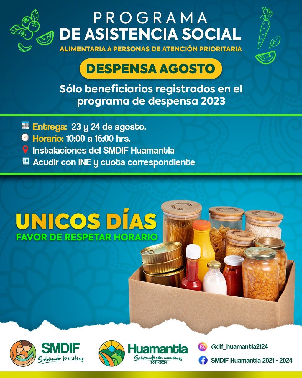 El Sistema Municipal para el Desarrollo Integral de la Familia Huamantla (SMDIF) informa a las y los beneficiarios del Programa de Asistencia Social Alimentaria a Personas de Atención Prioritaria, que se hará la entrega de despensas correspondientes a este mes, los días 23 y 24 de agosto en sus instalaciones ubicadas en Bulevar Fernando Hernández Carrasco #101.