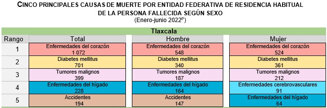 En la información preliminar del primer semestre de 2022, las enfermedades del corazón ocuparon el primer lugar dentro de las cinco principales causas de muerte en Tlaxcala, tanto a nivel general como por su distinción según sexo.