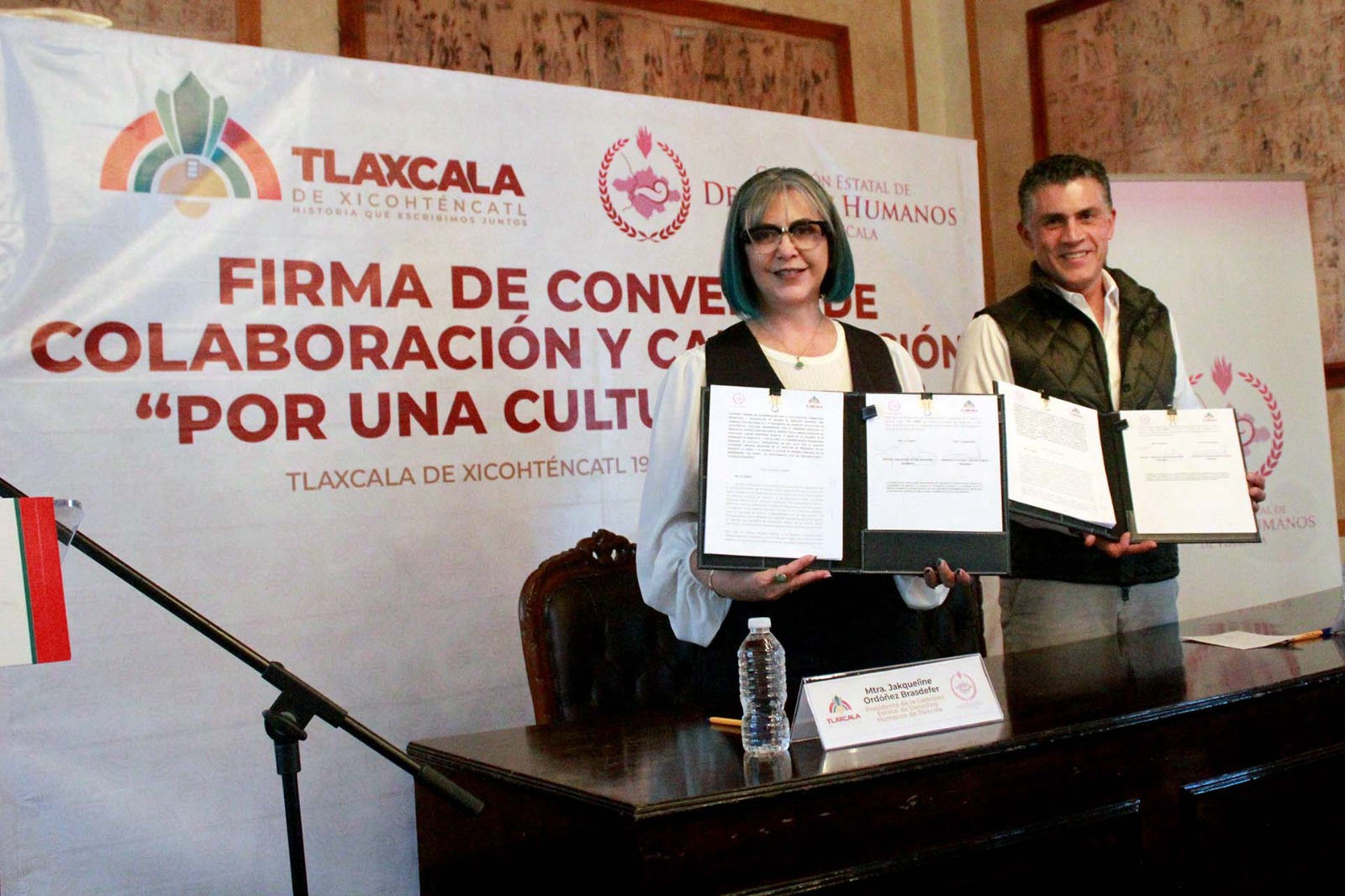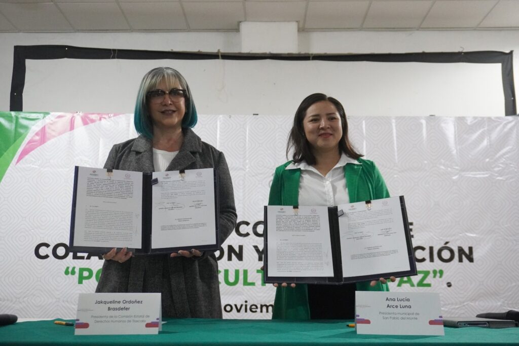En un esfuerzo por fortalecer a los gobiernos municipales en materia de promoción y garantía al respeto pleno de los Derechos Humanos, la presidenta de la Comisión Estatal de Derechos Humanos de Tlaxcala (CEDHT), Jakqueline Ordoñez Brasdefer, firmó convenios de colaboración y capacitación con la presidenta municipal de San Pablo del Monte, Ana Lucía Arce Luna y con el alcalde de Tlaxcala, Alfonso Sánchez García.