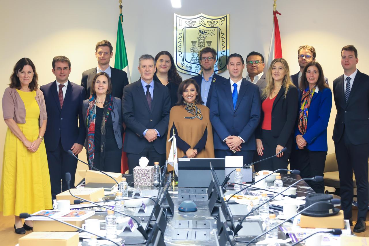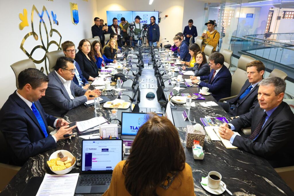 La gobernadora de Tlaxcala, Lorena Cuéllar Cisneros, se reunió con integrantes de la delegación de la Unión Europea en México, acompañada por el Secretario de Desarrollo Económico (Sedeco), Javier Marroquín Calderón y otros miembros del gabinete.