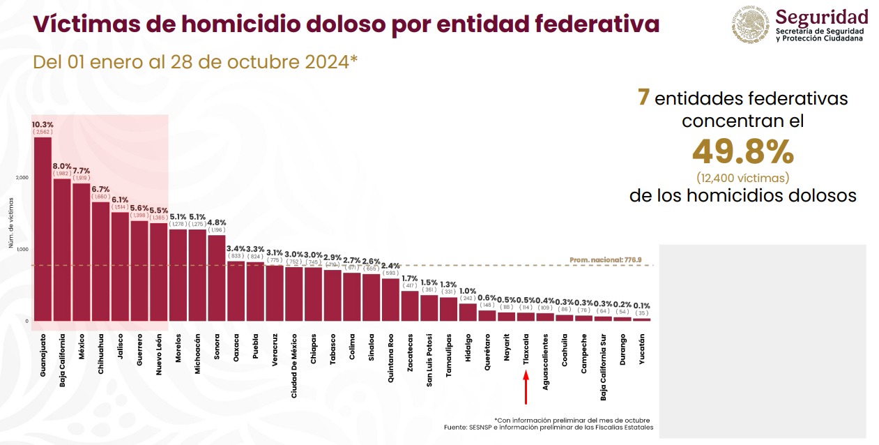 Según el análisis de víctimas de homicidio doloso por entidad federativa, a nivel nacional, siete estados concentran el 49.8% de los casos en el país al corte del 28 de octubre de 2024. Estos son: Guanajuato, con dos mil 562; Baja California, con mil 982; Estado de México, con mil 919; Chihuahua, con mil 660; Jalisco, mil 514; Guerrero, mil 398, y Nuevo León, con mil 365.