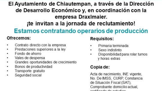 El Ayuntamiento de Chiautempan a través de la Dirección de Desarrollo Económico y en coordinación con la empresa Draxlmaier, invitan a la población a formar parte de la Jornada de reclutamiento de la empresa.
