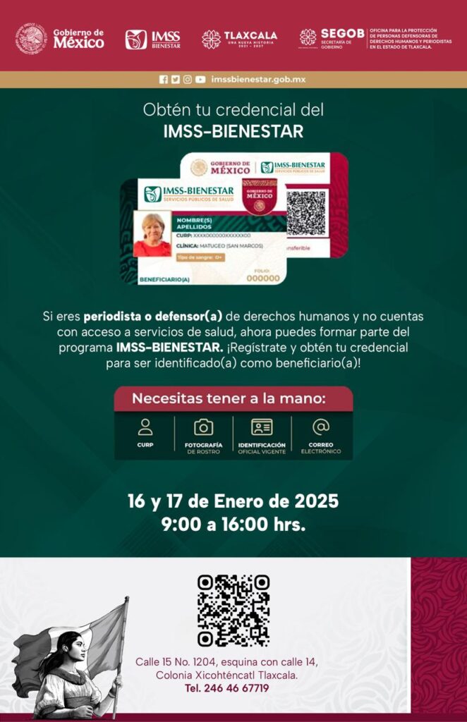 La Secretaría de Gobierno del estado (Segob), a través de la oficina para la protección de personas defensoras de derechos humanos y periodistas, en coordinación con el IMSS-Bienestar, pondrá en marcha la Jornada de Credencialización dirigida a comunicadores y defensores que no cuenten con seguridad social.