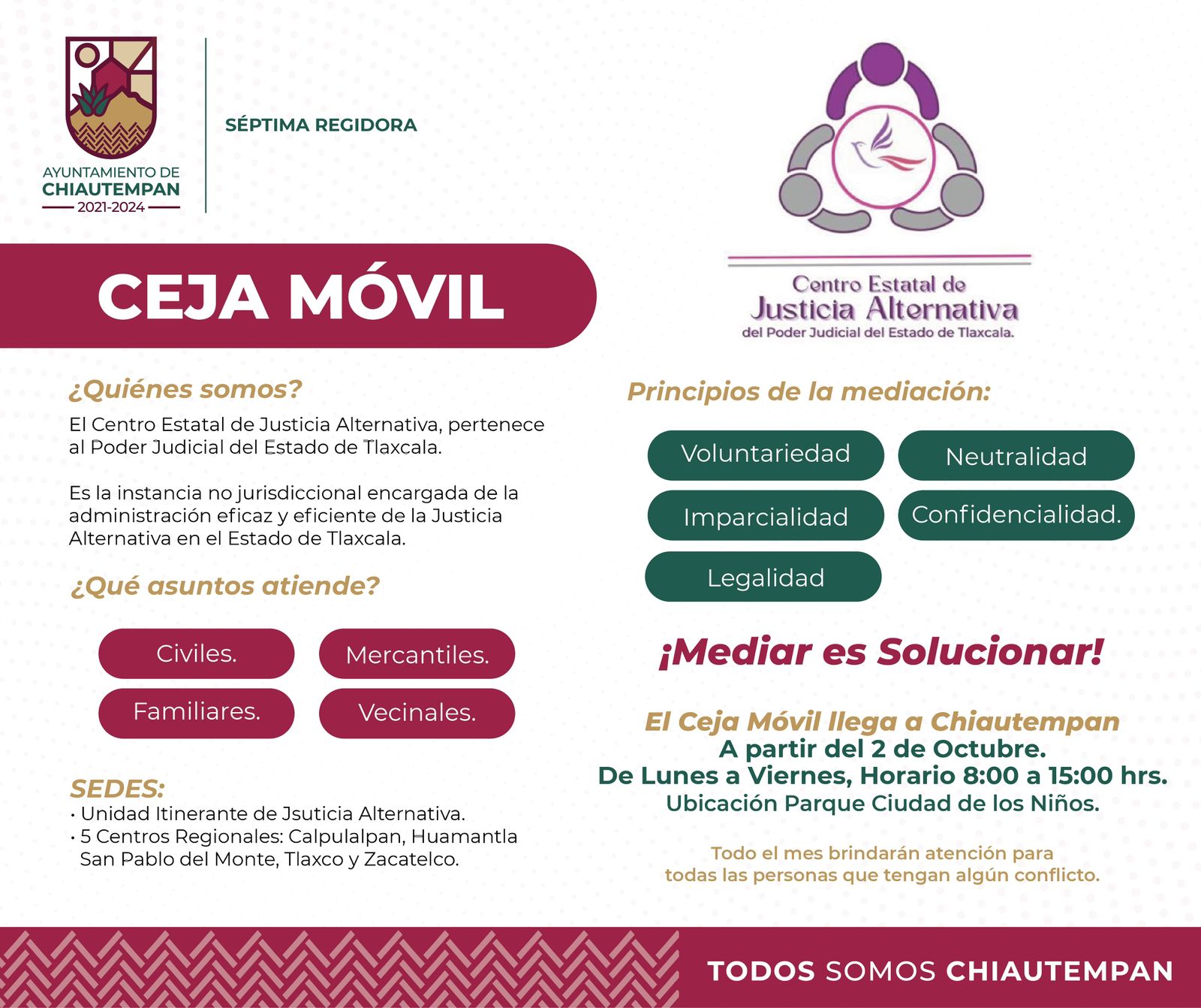 El Ayuntamiento de Chiautempan a través de la Séptima Regiduría, invita a la población a aprovechar los servicios que ofrece la Unidad Itinerante del Centro Estatal de Justicia Alternativa (CEJA) perteneciente al Tribunal Superior de Justicia del Estado (TSJE).