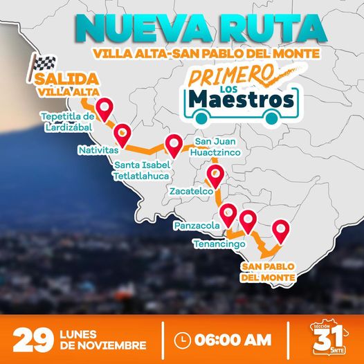 La nueva ruta empezará a funcionar a partir de lunes 29 de noviembre a las 6 de la mañana, y pasará por Tepetitla, Nativitas, Tetlatlahuca, Zacatelco, Huactzinco, Panzacola, Tenancingo y San Pablo del Monte.