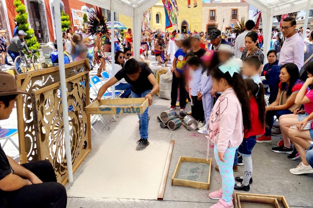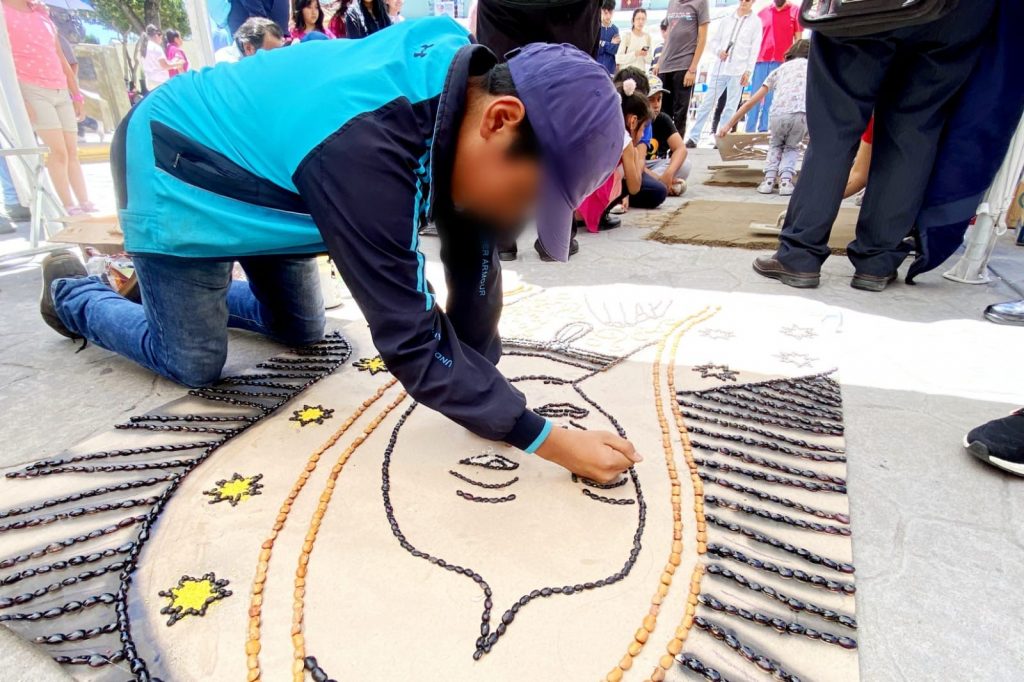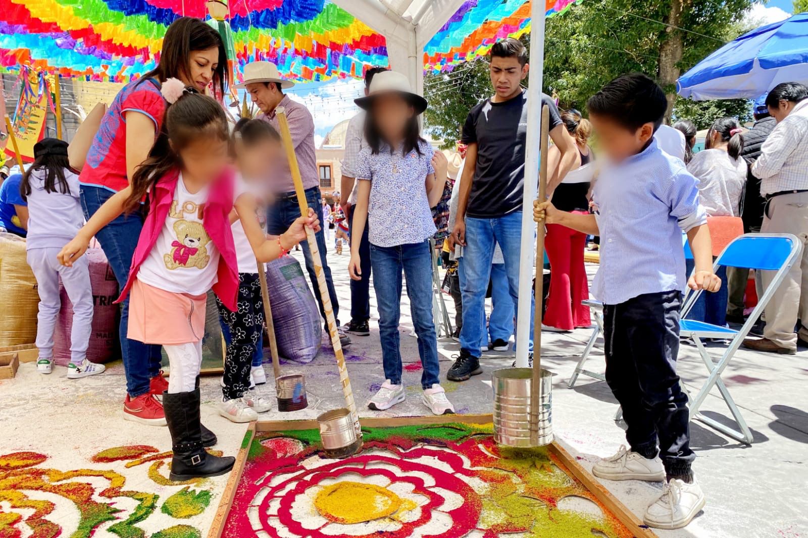 Cómo parte de la conmemoración del Día de la niña y el niño alfombrista, decenas de menores participaron en la elaboración de tapetes y alfombras de arte efímero con la supervisión de dos destacados maestros alfombristas de Huamantla.