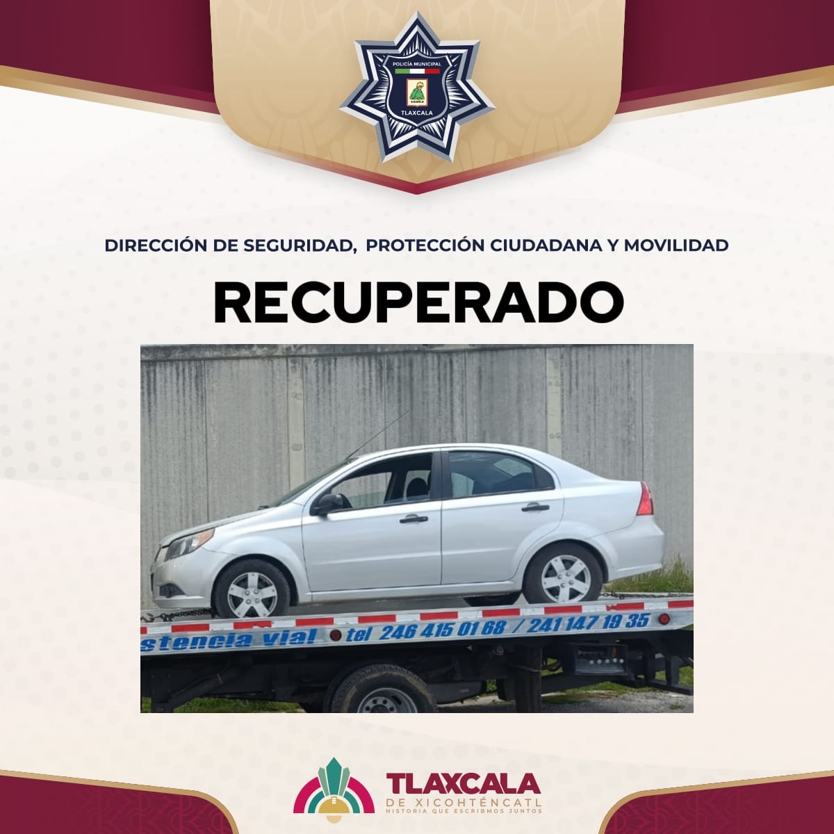 Durante un recorrido de vigilancia en la colonia La Loma Xicohténcatl, elementos de la Dirección de Seguridad, Protección Ciudadana y Movilidad del Municipio de Tlaxcala aseguraron un vehículo con alteraciones visibles en el número de identificación vehicular (NIV) y reporte de robo vigente.
