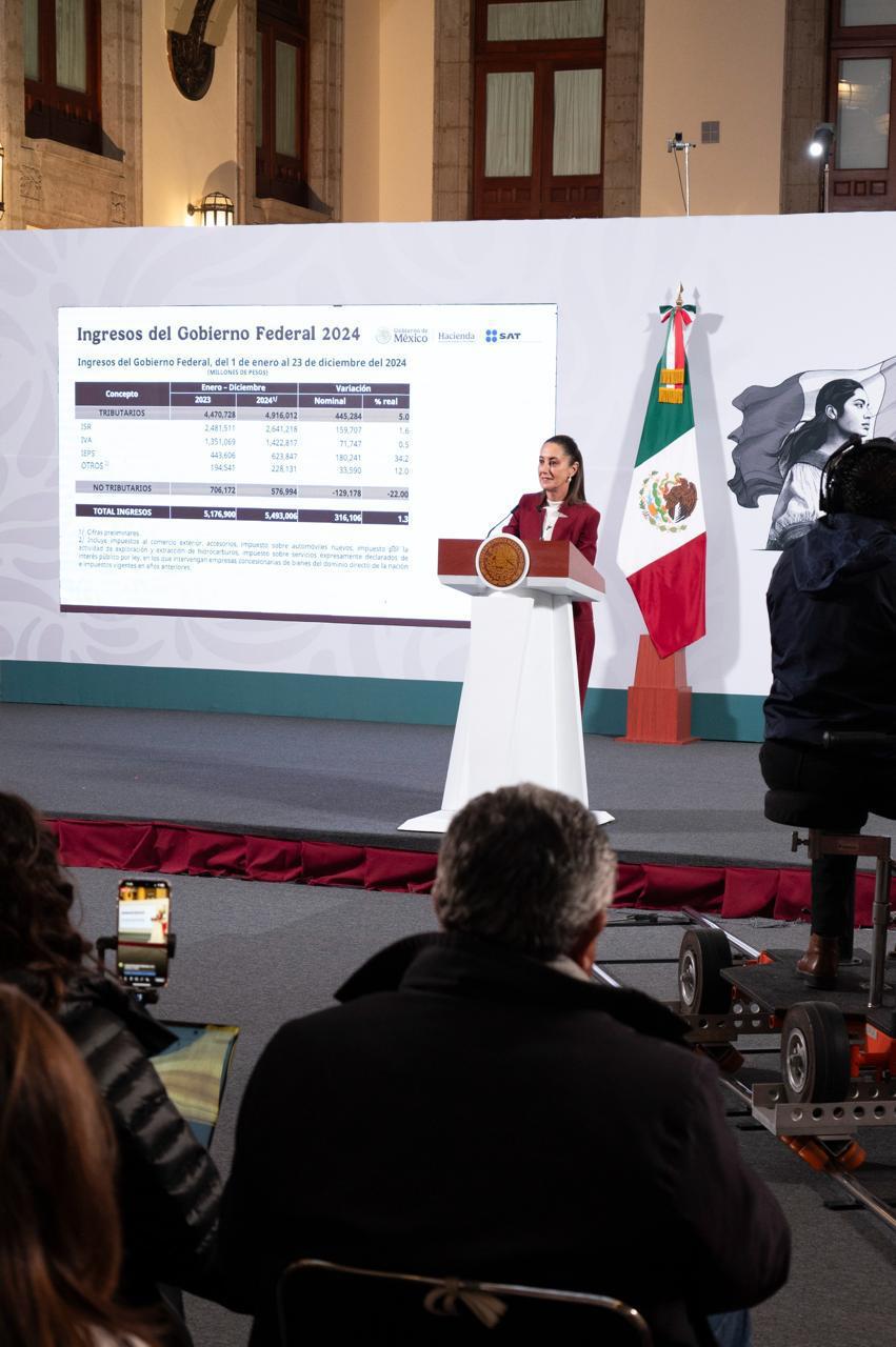 La Presidenta de México, Claudia Sheinbaum Pardo, destacó que como parte de la esencia de la Cuarta Transformación,que significa no aumentar impuestos y combatir la corrupción y los privilegios, se logró incrementar en 5 por ciento los ingresos tributarios en términos reales, del 1 de enero al 23 de diciembre de 2024, lo que asciende a 4.9 billones de pesos, es decir, representa 445 mil millones de pesos (mdp) más de ingresos en comparación con 2023.