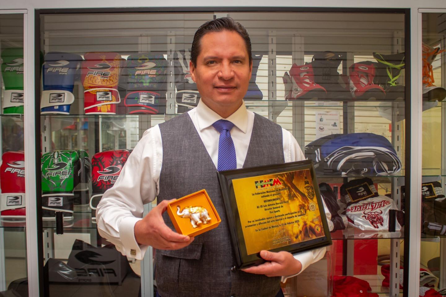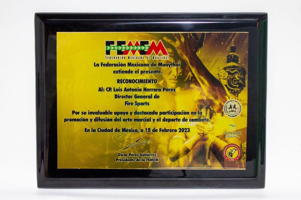 La Federación Mexicana de Muaythai (FEMEM) extendió en la Ciudad de México un reconocimiento a Luis Antonio Herrera Pérez, Director General de Fire Sports, por su invaluable apoyo y destacada participación en la promoción y difusión del arte marcial y el deporte de combate en México.