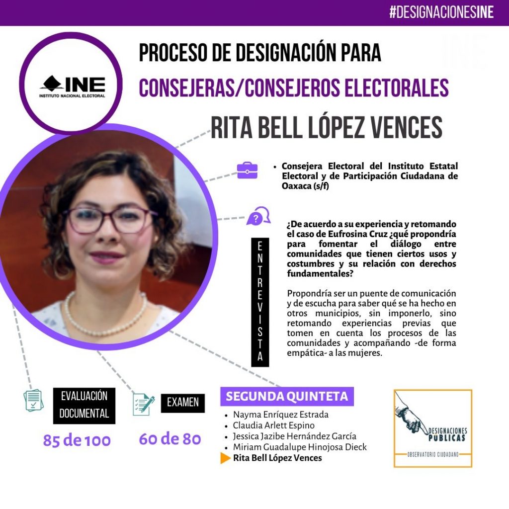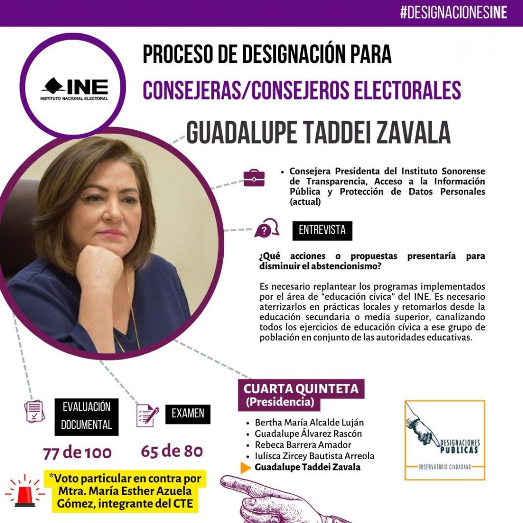 Cabe señalar que como consejera presidenta se designó a Guadalupe Taddei Zavala, comisionada presidenta del Instituto Sonorense de Transparencia; mientras que para consejeros electorales fueron electos Rita Bell López Vences, exconsejera electoral de Oaxaca; Jorge Montaño Ventura, fiscal de delitos electorales de Tabasco; y Arturo Castillo Loza, exconsejero electoral de Jalisco.