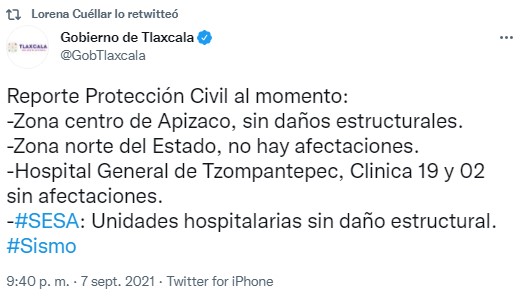 Protección Civil informó que la zona centro de Apizaco no registra daños estructurales, y que en la zona norte del Estado no hay afectaciones.