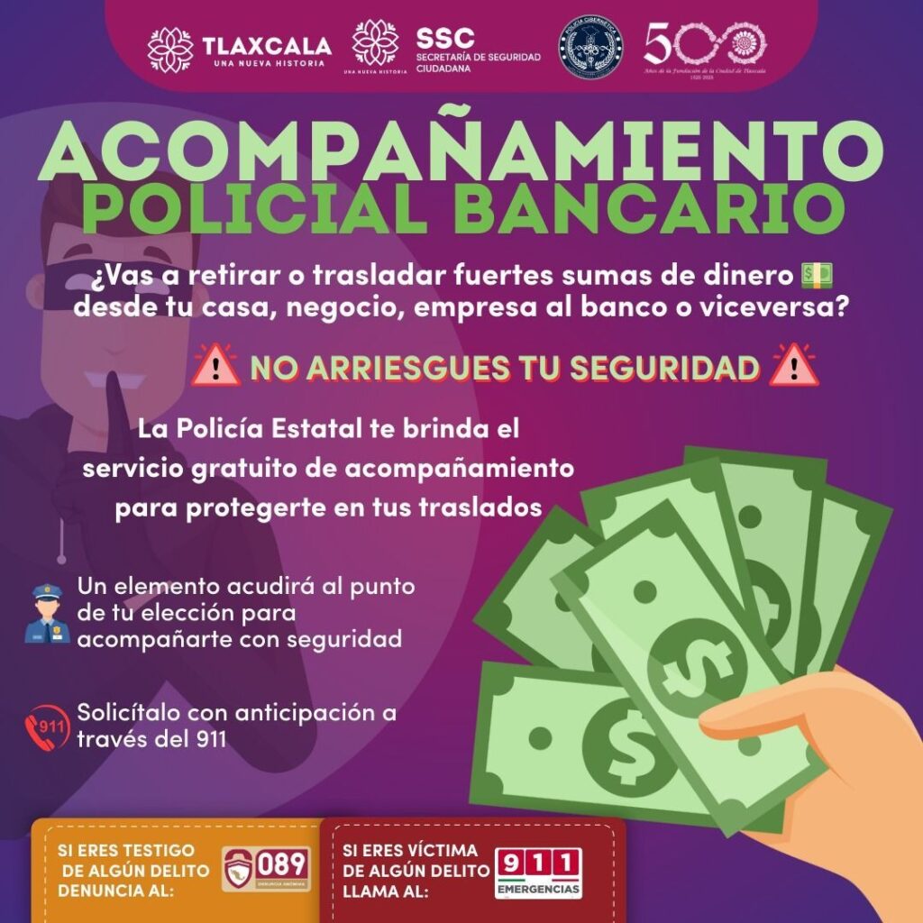 Con el objetivo de prevenir delitos relacionados con el manejo de efectivo, la Secretaría de Seguridad Ciudadana (SSC) del estado de Tlaxcala mantiene activo el servicio gratuito de “Acompañamiento Policial Bancario”, dirigido a personas físicas y empresas que realizan movimientos financieros de alto valor.