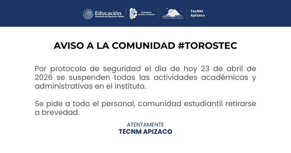 El Instituto Tecnológico de Apizaco (ITA) suspendió de forma repentina sus actividades académicas y administrativas la mañana de este jueves 23 de abril, luego de un reporte de posible riesgo al interior del plantel que derivó en un desalojo masivo y la movilización de corporaciones de seguridad.