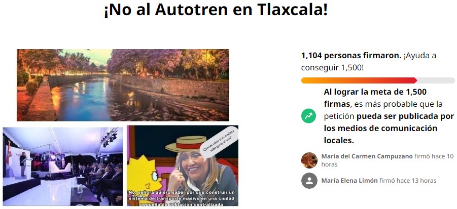 JOSÉ RAMÍREZ A través de la plataforma CHANGE.ORG, suman ya más de mil 100 firmas de personas que rechazan el proyecto denominado “Autotrén Tlaxcala”. En el...