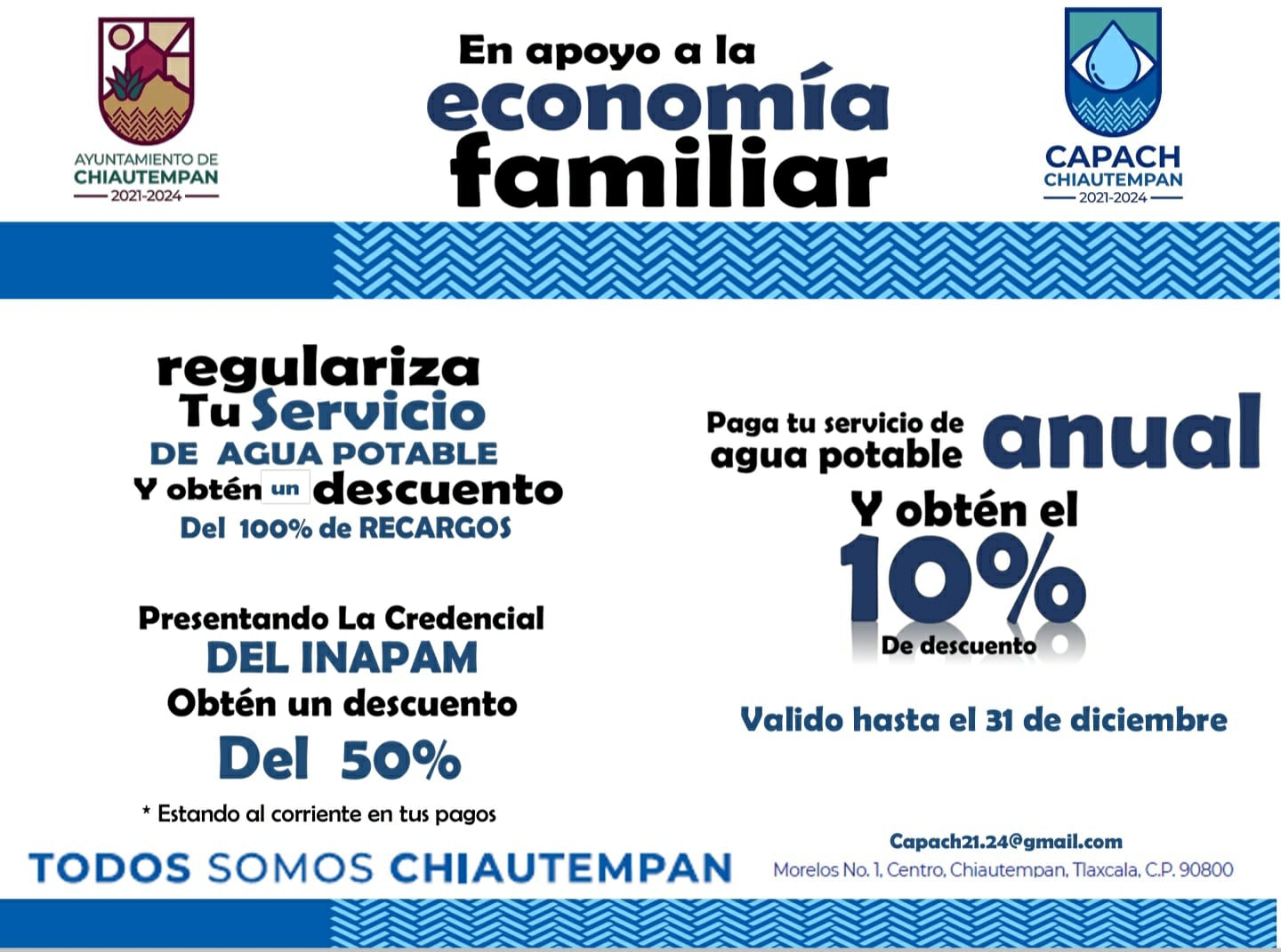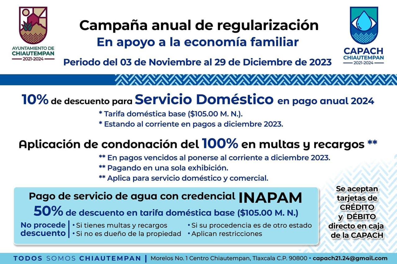 OTROSDATOS.COM.MX La Comisión de Agua Potable y Alcantarillado de Chiautempan (Capach), exhorta a la ciudadanía a aprovechar la Campaña de Regularización del Servicio del Agua Potable,...