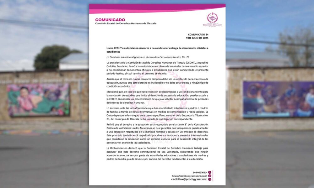 La presidenta de la Comisión Estatal de Derechos Humanos de Tlaxcala (CEDHT), Jakqueline Ordoñez Brasdefer, llamó a las autoridades escolares de los niveles básico y medio...