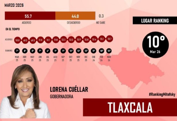LUIS ROMERO La gobernadora de Tlaxcala, Lorena Cuéllar Cisneros, se colocó dentro del top 10 nacional de mandatarios mejor evaluados, de acuerdo con el más reciente...