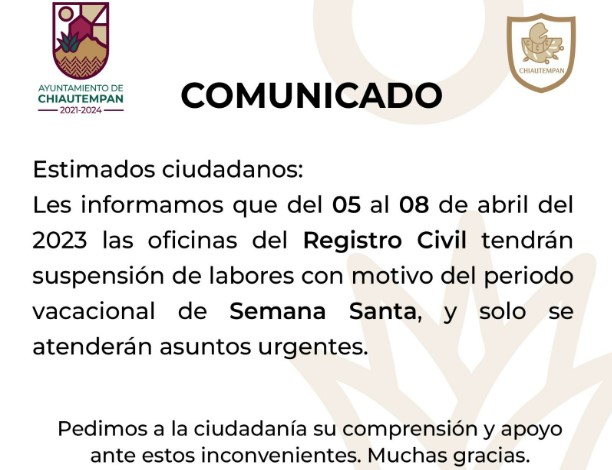 OTROSDATOS.COM.MX El Ayuntamiento de Chiautempan, informa sobre la suspensión de actividades en las oficinas de Registro Civil del municipio, por motivo del festejo de la Semana...