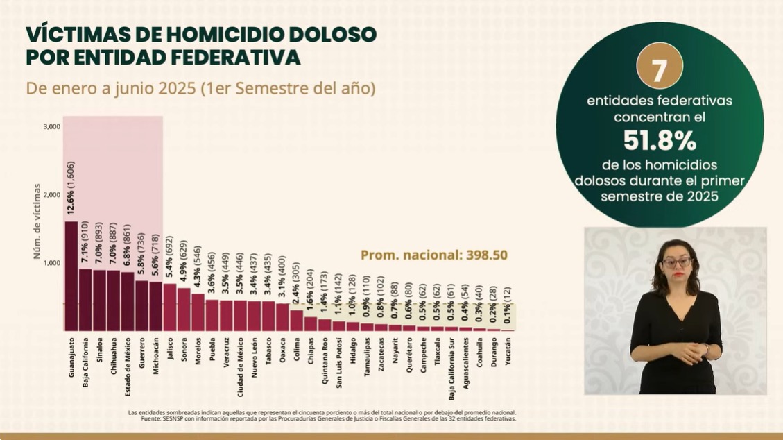 En contraste, siete entidades concentraron el 51.8% de los homicidios dolosos registrados entre enero y junio de 2025: