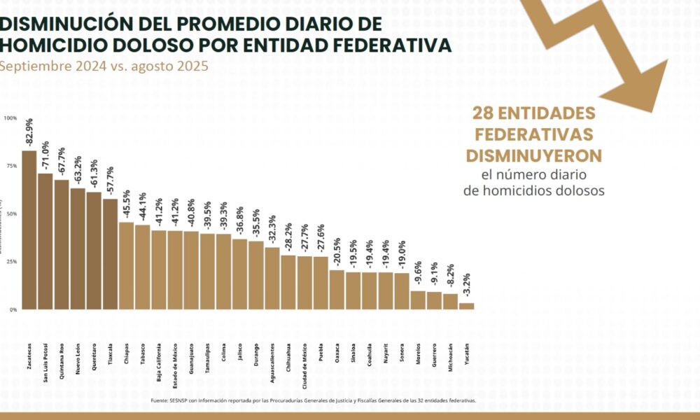 En total, 28 entidades federativas lograron reducir este tipo de violencia letal en el país, lo que representa una mejora generalizada en materia de seguridad, según la estadística oficial del Gobierno Federal.