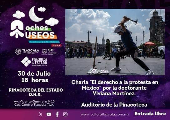 En la Pinacoteca del Estado, a las 18:00 horas, la doctorante Viviana Martínez impartirá la charla “El derecho a la protesta en México”, seguida de una pieza performática titulada “Zona de descarga”, que explora la relación entre cuerpo, territorio y resistencia.