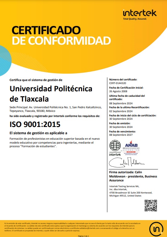 En un paso significativo hacia la excelencia académica y administrativa, la Universidad Politécnica de Tlaxcala (UPTx) ha obtenido la certificación bajo la norma internacional ISO 9001:2015, reafirmando su compromiso con la calidad y la mejora continua en todos sus procesos institucionales.